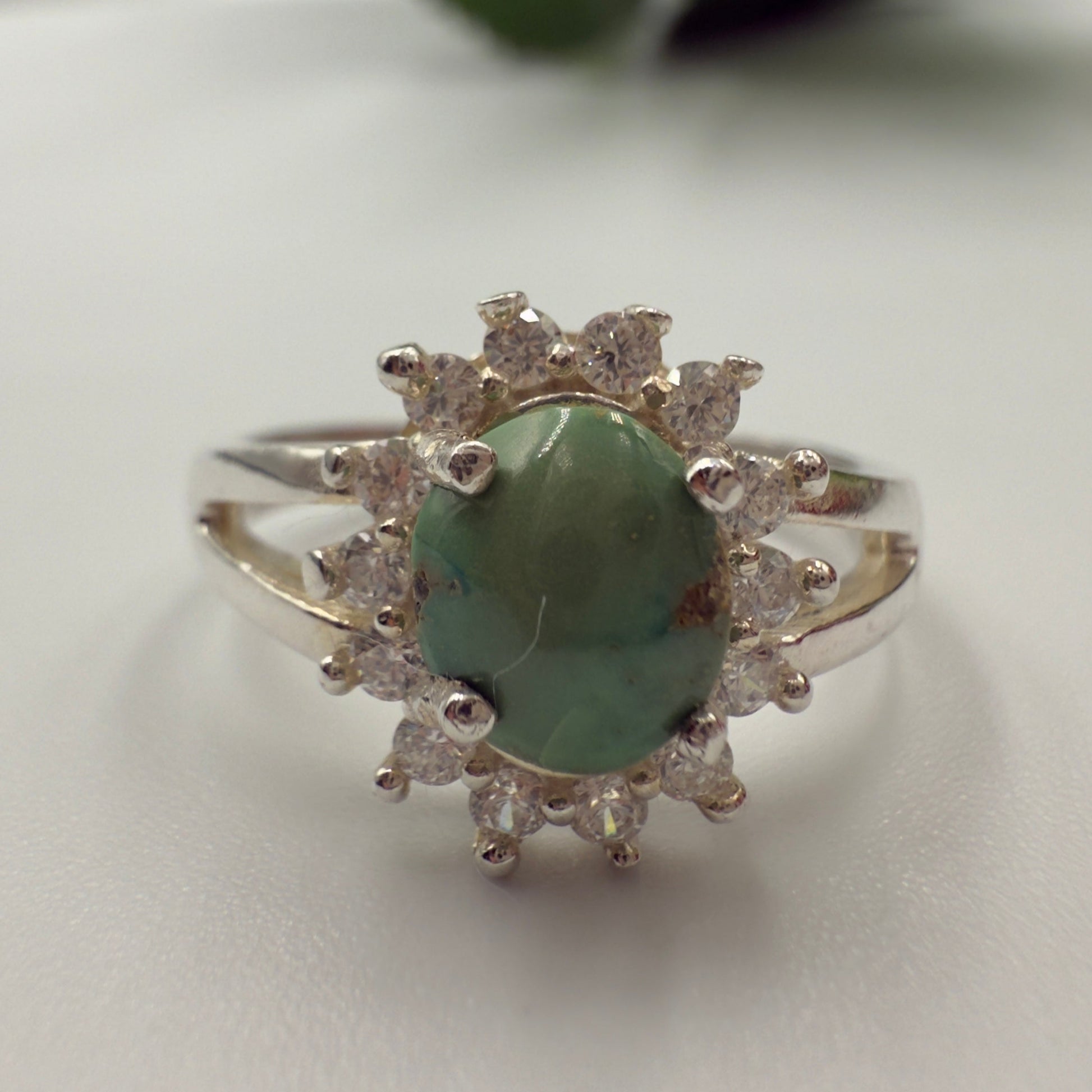 A serene green cabochon gemstone takes center stage in this elegant ring, framed by a radiant halo of sparkling white accent stones. The sleek sterling-silver band adds a contemporary touch while highlighting the stone’s natural beauty, making this piece perfect for both daily wear and special occasions.
