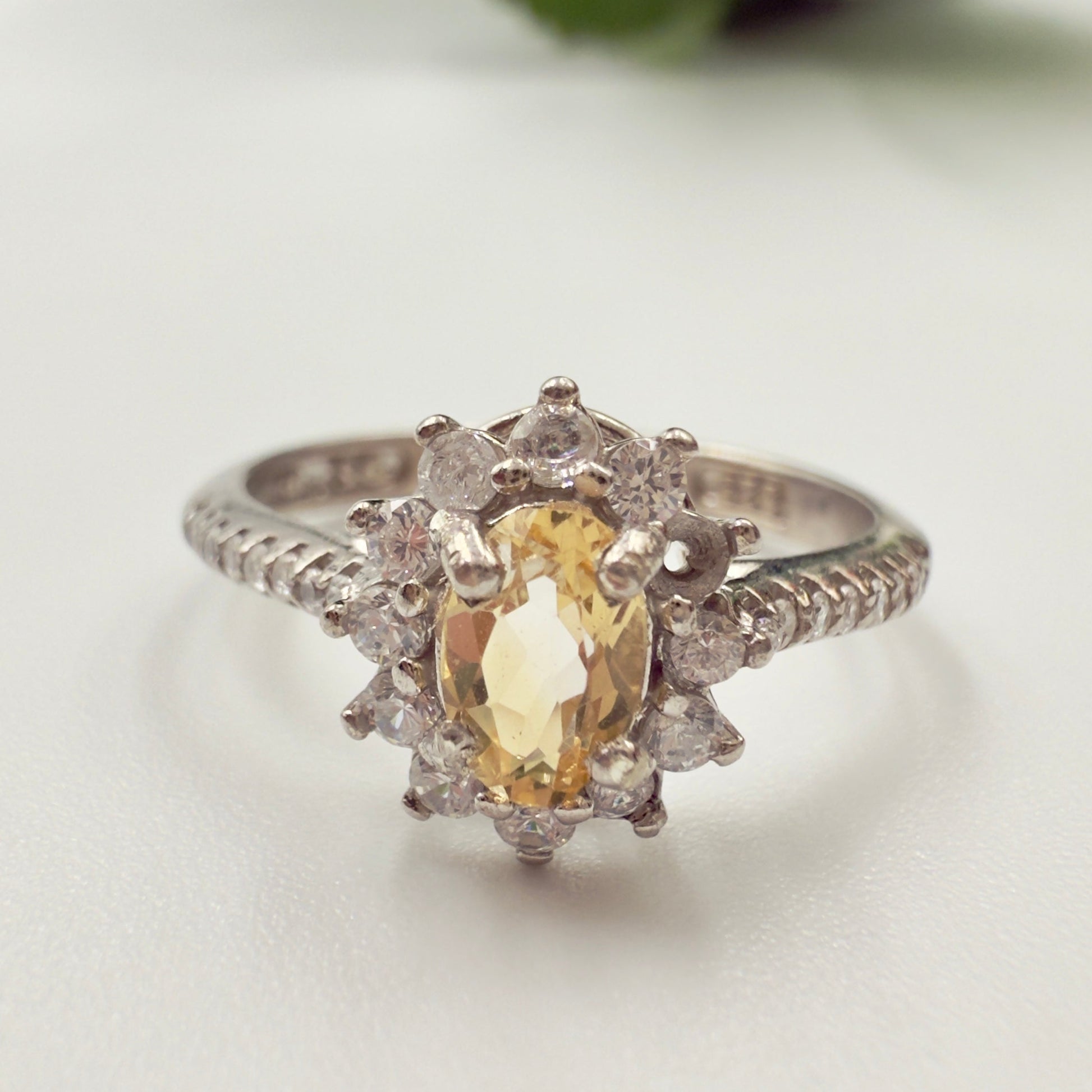 A stunning oval-cut natural yellow sapphire radiates warm golden light, encircled by a halo of brilliant white accent stones. The finely crafted sterling-silver band, with its pavé detailing, adds extra sparkle and elegance. Perfect for anniversaries, engagements, or as a luxurious everyday piece.