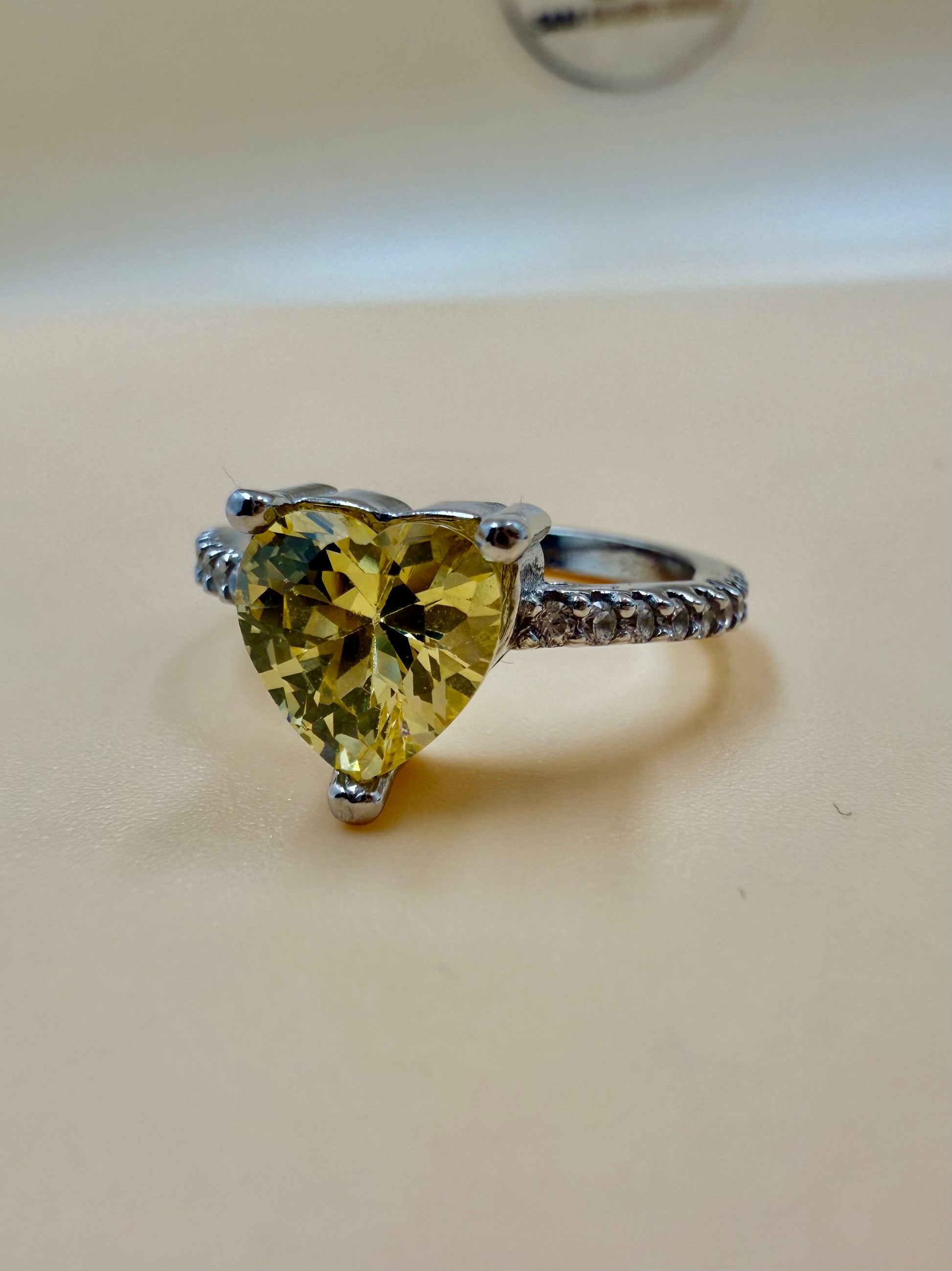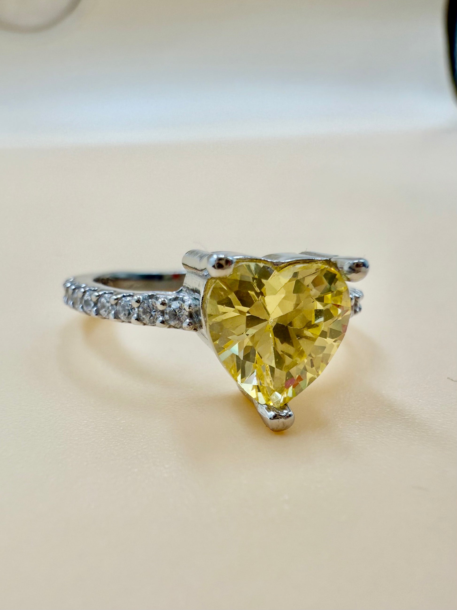Celebrate romance and sunshine sparkle with this enchanting ring. A radiant heart-cut yellow zircon takes center stage, set in a sleek, high-polish band that enhances its golden glow. Perfect as a promise ring, a thoughtful gift, or a vibrant statement piece for everyday elegance.