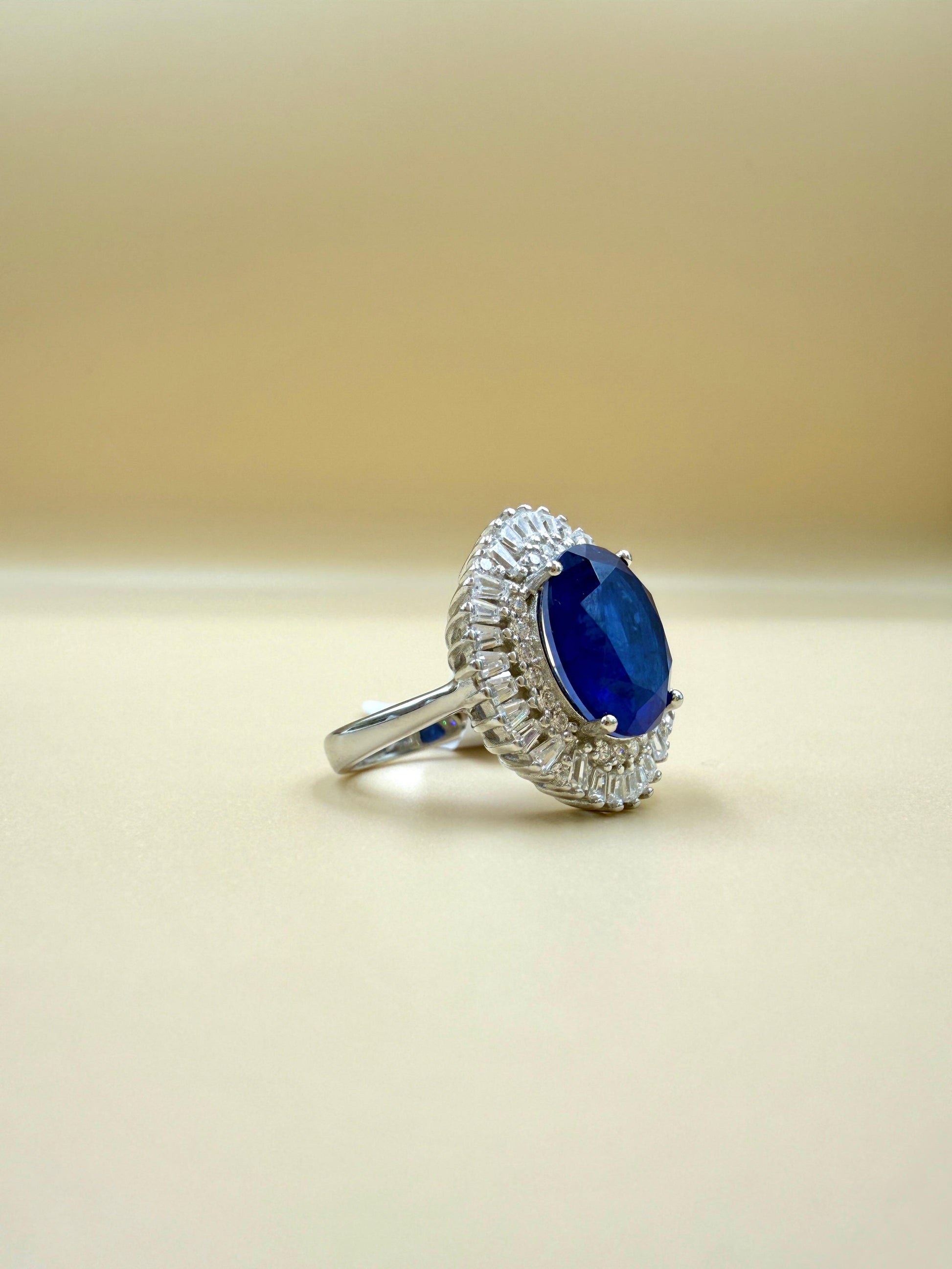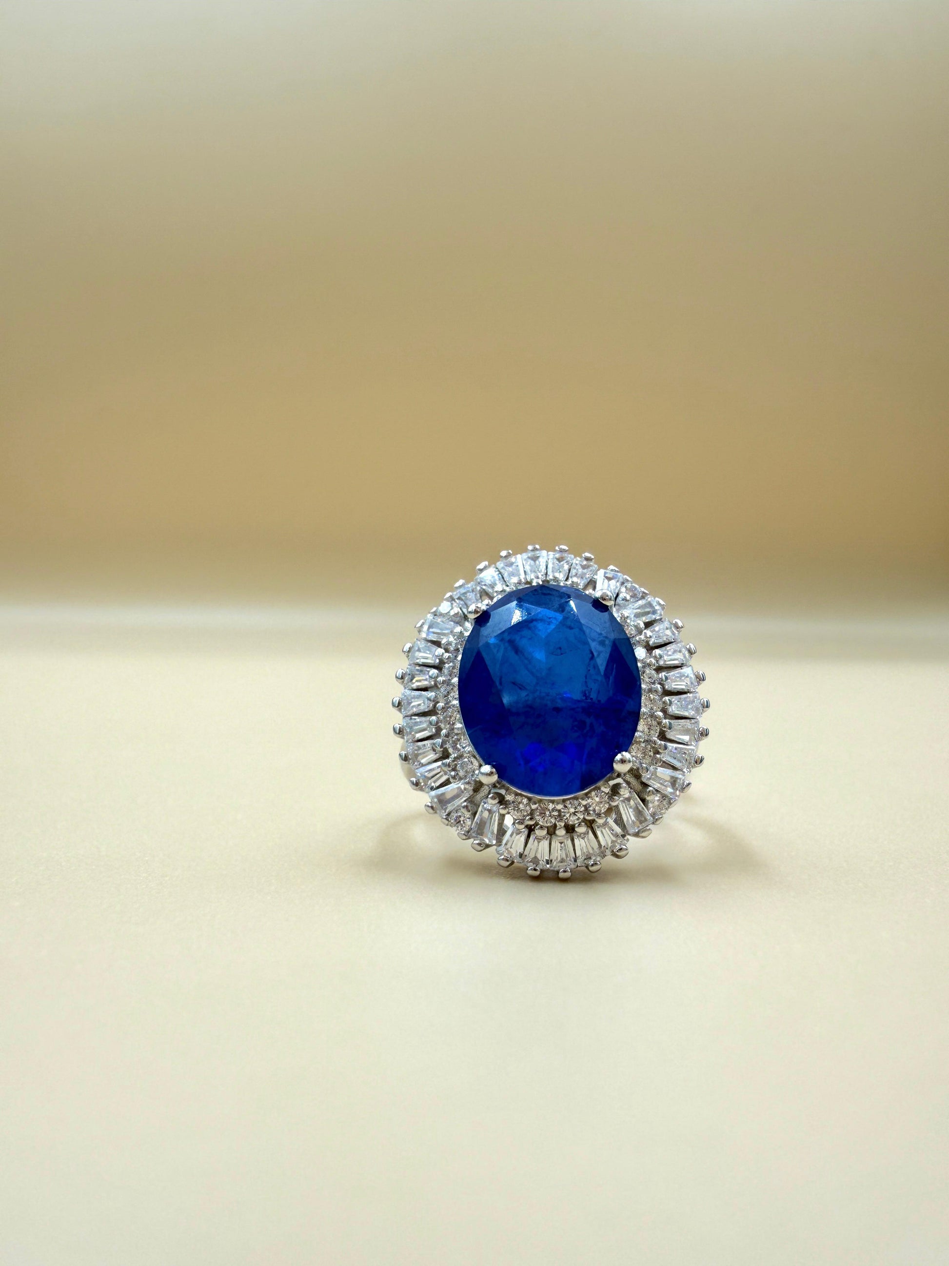 timeless luxury with this magnificent oval blue gemstone ring. The bold center stone radiates deep royal blue hues, beautifully framed by a double halo of dazzling clear stones for maximum brilliance. Set in a sleek silver band, this ring exudes sophistication and glamour—perfect for special occasions, evening elegance, or as a cherished gift for someone extraordinary.